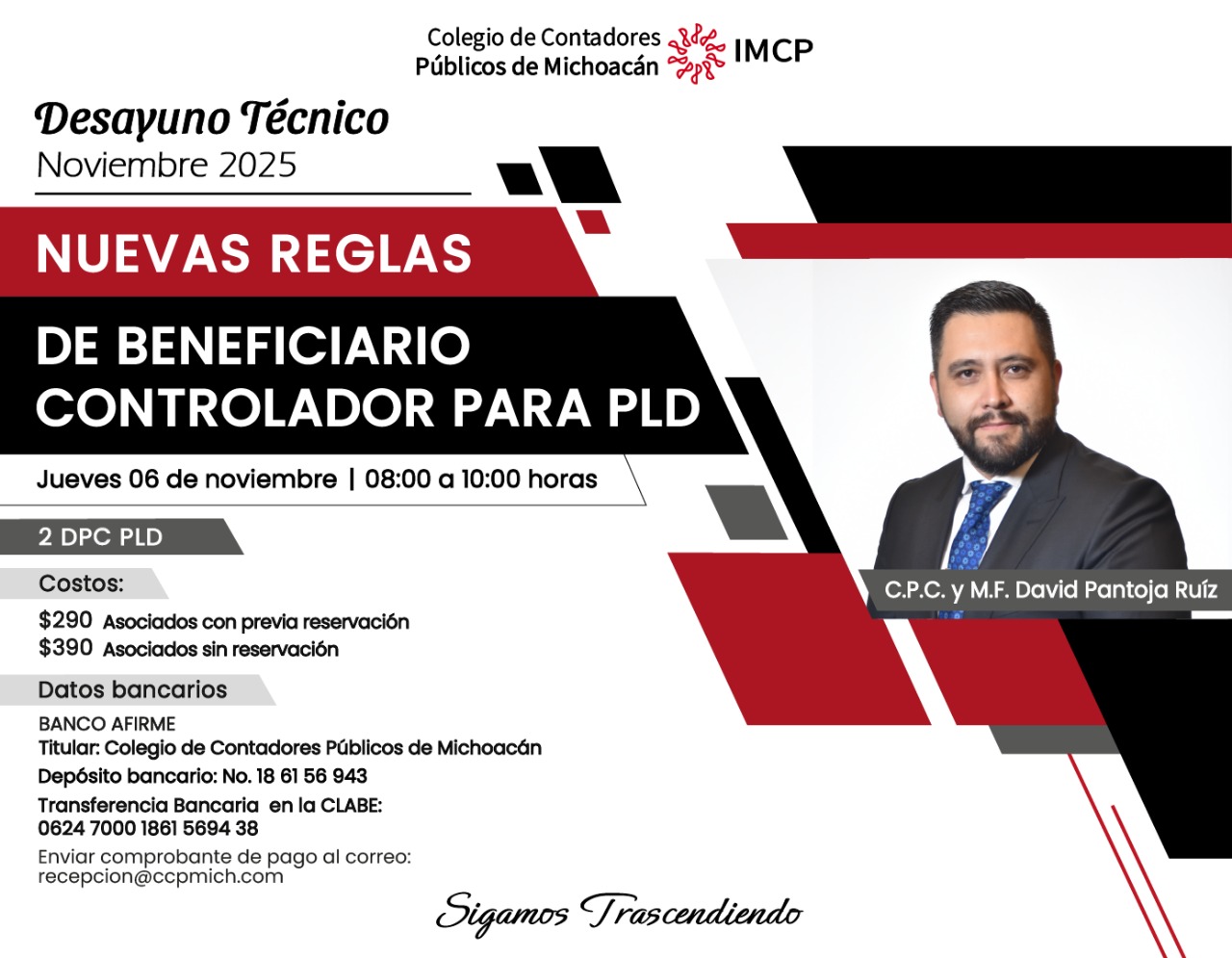 2025-11-06 Expositores:C.P.C. y M.F. David Pantoja Ruíz Nuevas reglas de beneficiario controlador para PLD 08:00:00 – 10:59:00 Galería Agregar foto